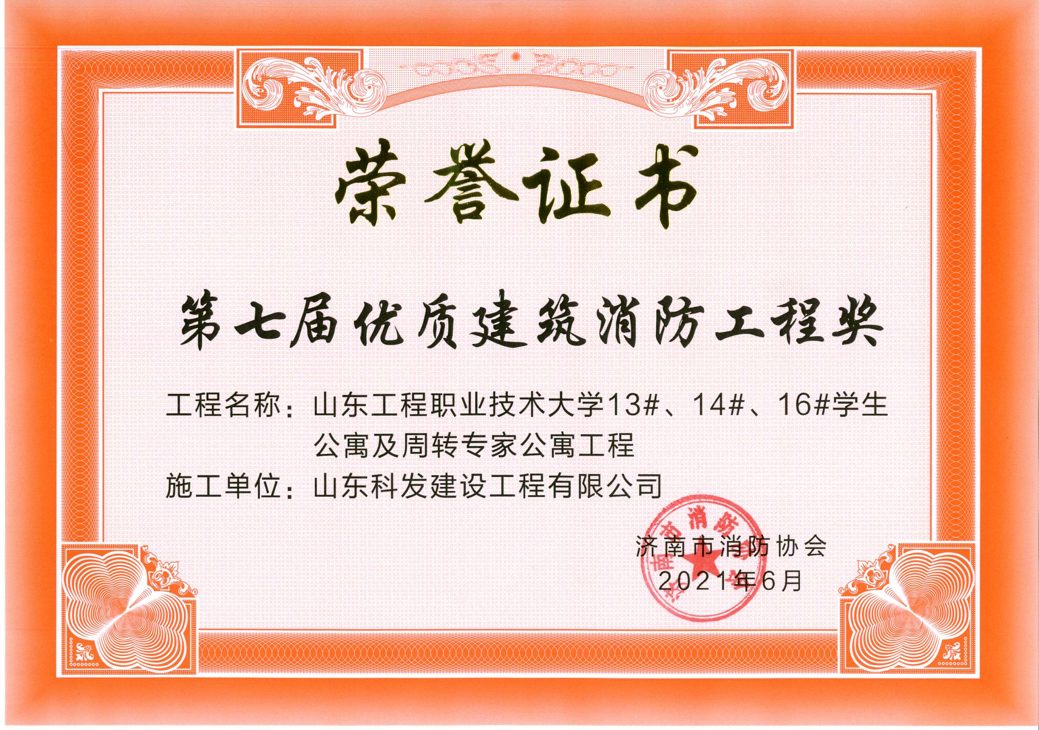 2021年6月24日,濟(jì)南市消防協(xié)會(huì)公布了2021年度濟(jì)南市優(yōu)質(zhì)建筑消防工程獎(jiǎng)入選工程名單。山東科發(fā)建設(shè)工程有限公司承建的山東工程職業(yè)技術(shù)大學(xué)13#、14#、16#學(xué)生公寓及周轉(zhuǎn)專家公寓工程榮獲濟(jì)南市第七屆優(yōu)質(zhì)建筑消防工程獎(jiǎng),這是公司連續(xù)兩年榮獲該獎(jiǎng)項(xiàng)。