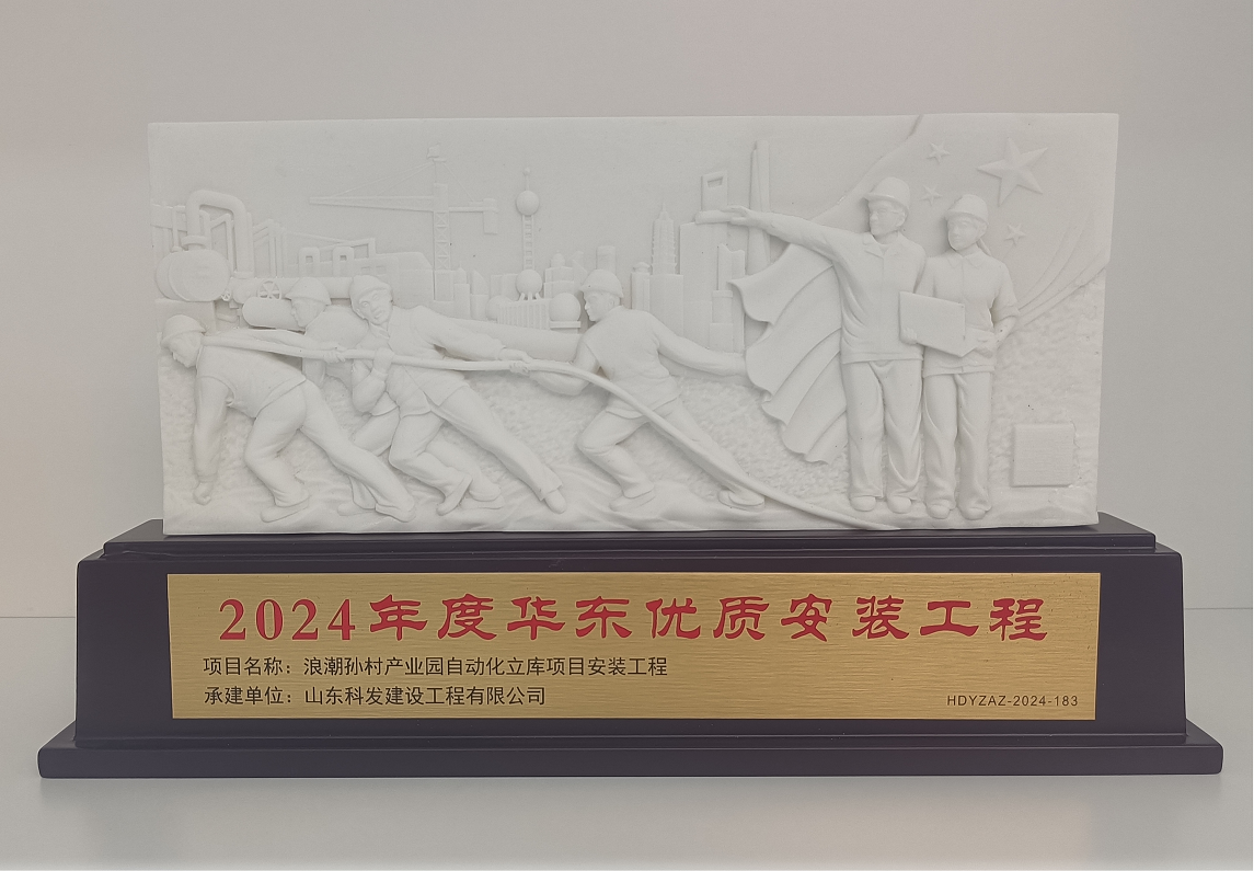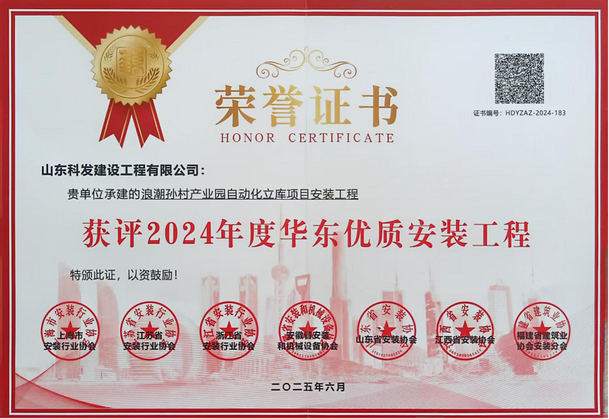 近日,華東六省一市安裝協(xié)會聯(lián)合發(fā)布了《關(guān)于公布2024年度華東優(yōu)質(zhì)安裝工程評價結(jié)果的通知》,山東科發(fā)建設工程有限公司承建的浪潮孫村產(chǎn)業(yè)園自動化立庫項目安裝工程榮獲“華東優(yōu)質(zhì)安裝工程獎”。